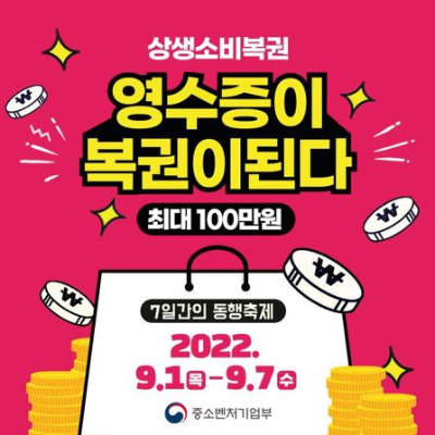 중소벤처기업부가 진행하는 '7일간의 동행 축제'가 9월 1일부터 7일까지 열립니다. 이번 7일간의 동행 축제가 열리는 동안 전 국민을 대상으로 하는 영수증 추첨방식의 상생소비복권 이벤트가 열린다는 사실 알고 계신가요? 3만 원 이상 결제한 영수증만 있으면 최대 100만 원 당첨의 기회가 주어집니다. 오늘은 상생소비복권 응모방법에 대해 살펴보도록 하겠습니다.