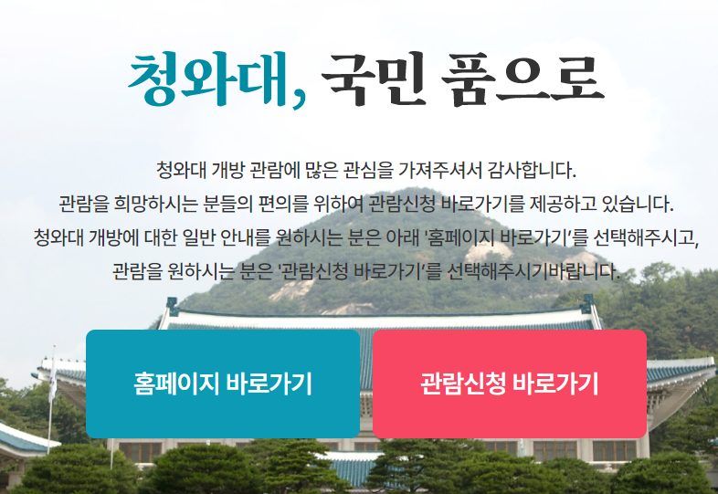 오늘의 글을 끝까지 읽어보신다면 청와대 개방 예약, 청와대 개방 홈페이지, 청와대 개방 관람 신청 등에 대해서 알아가실 수 있으니 꼭 끝까지 글을 읽어보시고 청와대 개방을 예약하신 후에 그동안 베일에 쌓여있던 청와대를 관람하시기를 바랍니다.