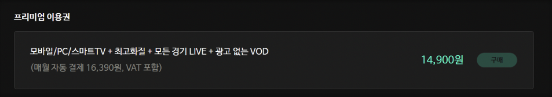 ▲ 프리미엄 이용권은 모바일/PC/스마트TV 모든 단말기에서 시청할 수 있으며 가격은 14,900원입니다. WEB에서 이용할 시 14,900원이며, 인앱 결제(앱스토어, 플레이 스토어 어플에서 결제) 시 19,000원 입니다.