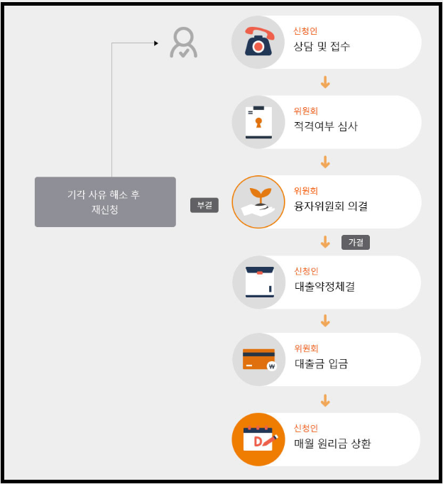 - 대출을 신청하고자 하는 경우 우선 상담센터(1600-5500)를 통해 신청요건을 확인한 후 지부 심사역의 안내에 따라 필요한 서류를 준비필요