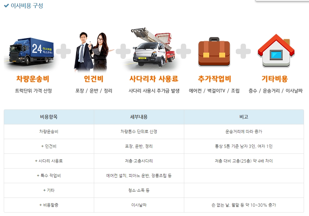 위 사진에서 확인할 수 있듯이, 이사비용 구성은 차량 운송비, 인건비, 사다리차 사용료, 추가 작업비, 기타 비용 이렇게 구성이 됩니다.
